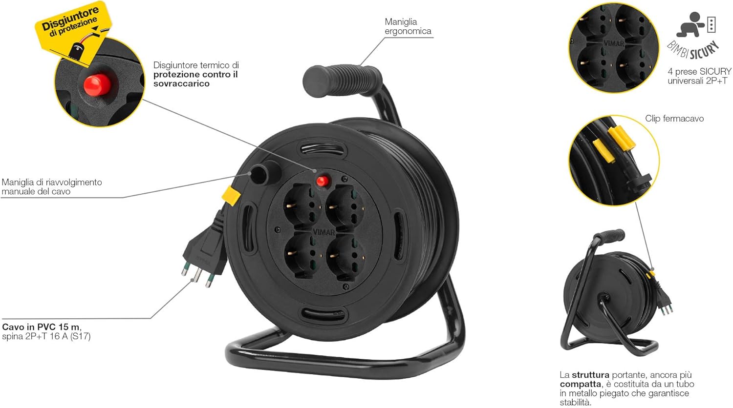 Quando si lavora in casa, in cantina o all’esterno, il problema non è solo arrivare con il cavo dove serve. Bisogna anche evitare grovigli, sovraccarichi e prese scomode. Qui entra in gioco Vimar 0P32730 Avvolgicavo 16A, dotato di 15 metri di cavo, 4 prese universali e spina italiana standard 16A tipo L a 3 poli.